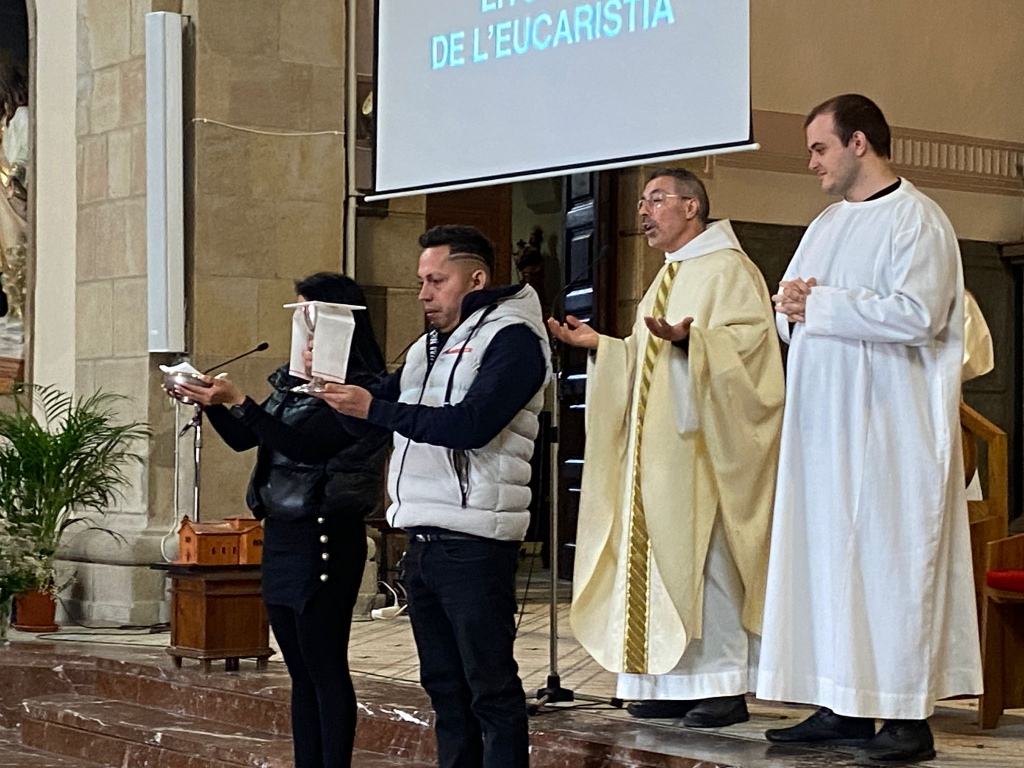 En les ofrenes diferents membres de la comunitat han portat una maqueta d’un temple, una fotografia de la nostra parròquia de Santa Eulàlia com a símbols d’aquesta Jornada de germanor en la que tots hem de col·laborar en el finançament de la nostra comunitat parroquial.