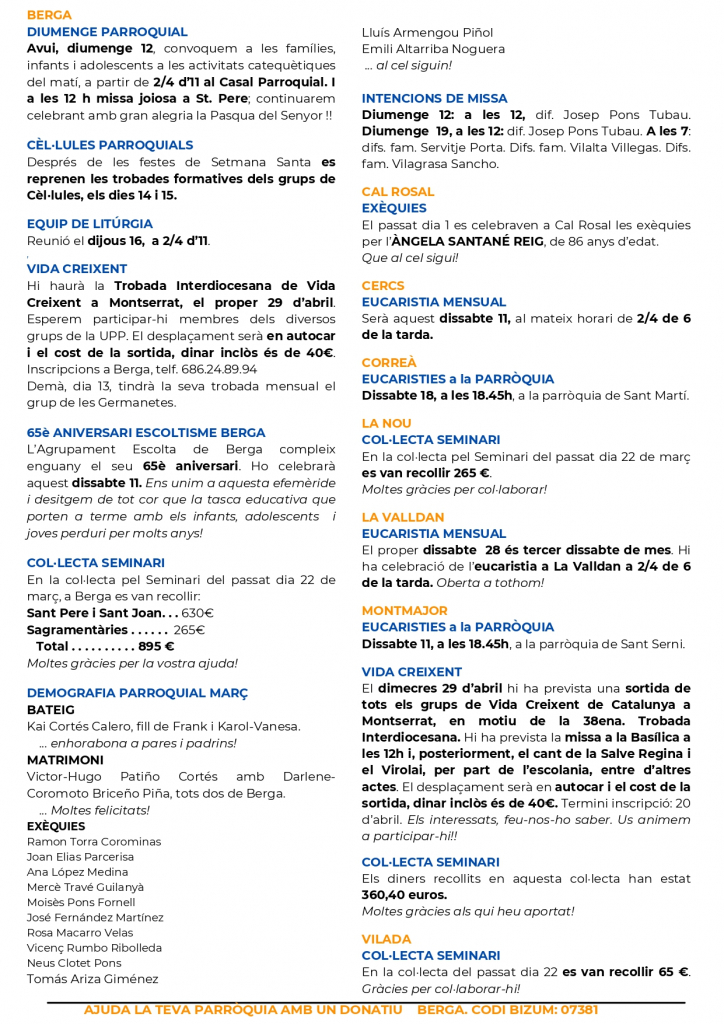 Al matí les pedres centenàries del Casc Antic de Berga han contemplat el pas de la Creu de Jesús, acompanyada d’un bon nombre de fidels berguedans seguint les catorze estacions del tradicional Via Crucis, el camí dolorós que seguí Jesús i el portà fins a la seva mort, que és la nostra salvació. S’inicià amb el res de les Laudes, previ a la sortida dels fidels en dues columnes que acompanyaven a la Creu fins a retornar al temple parroquial.