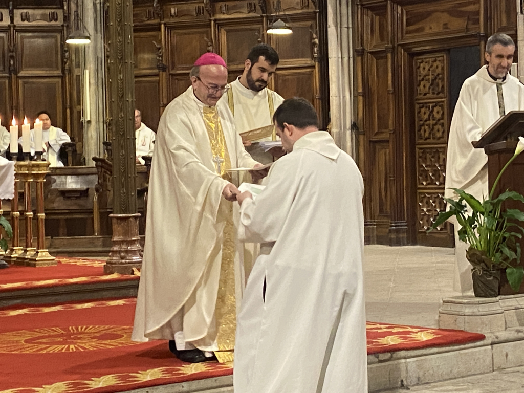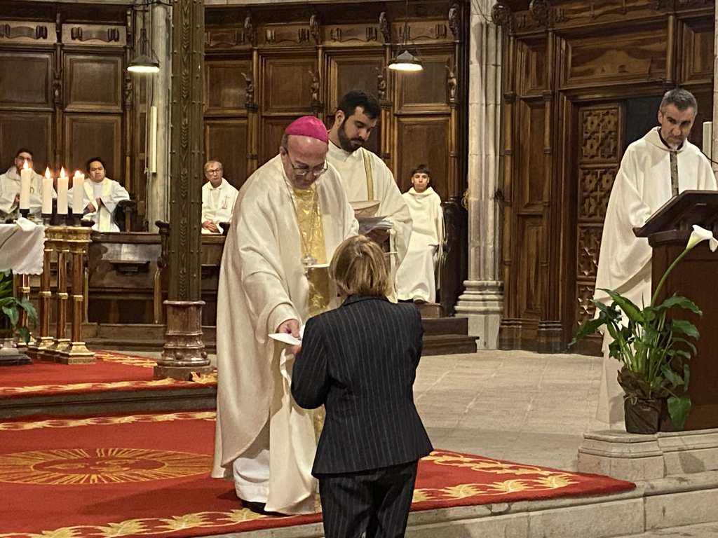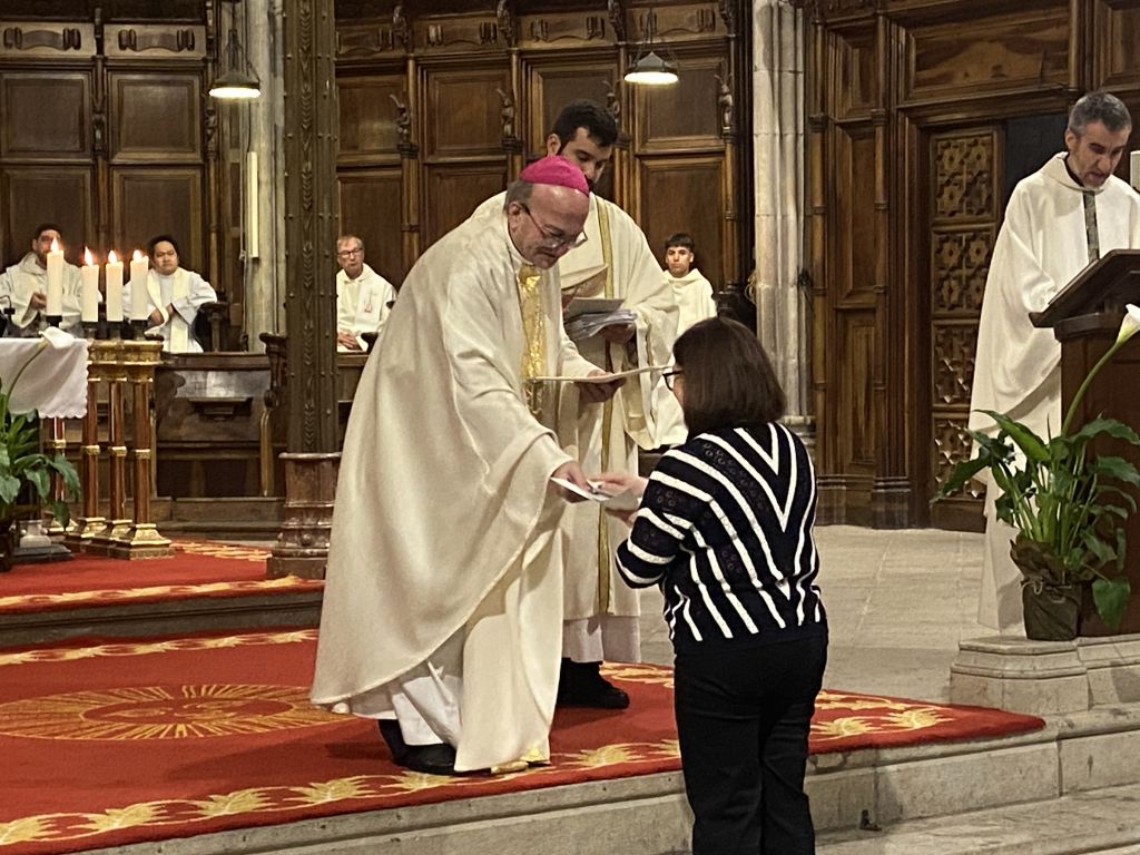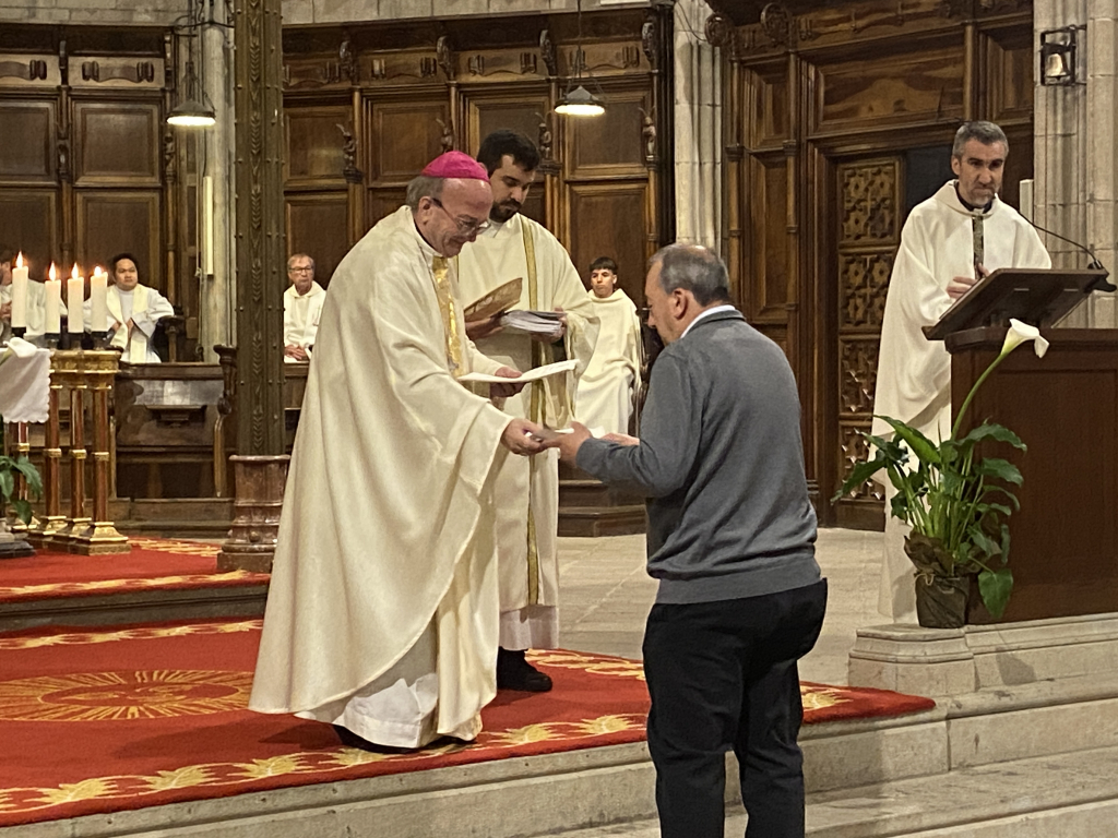 Acabada la homilia tots els candidats han estat cridats als peus del presbiteri on el Bisbe Francesc, on formant un semicercle han escoltat l’al·locució inicial, l’examen en que el celebrant els ha demanat la seva voluntat a rebre el ministeri extraordinari i el seu compromís a dur-lo a terme amb tot el respecte, rebent tot seguit la benedicció conjunta, acabant l’acte amb l’entrega un a un del nomenament i una insígnia que els distingeix com a Ministres de la Comunió.