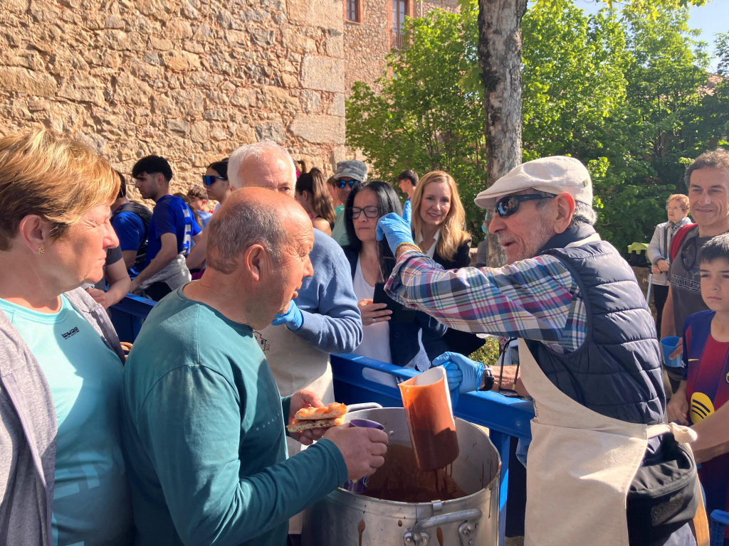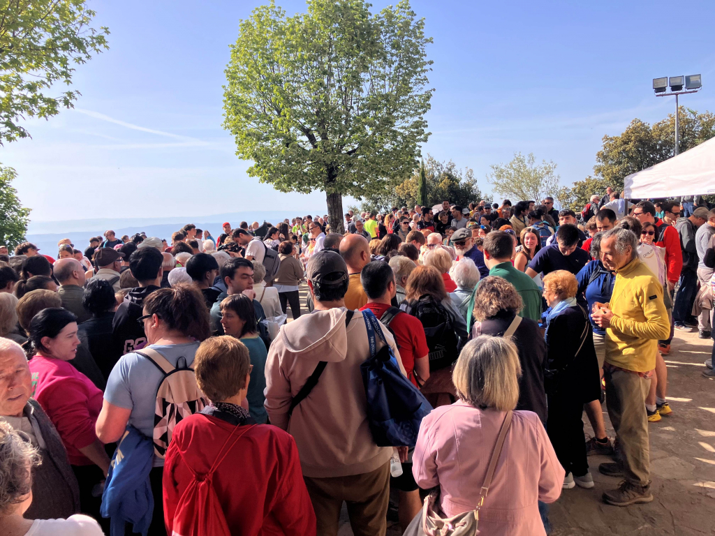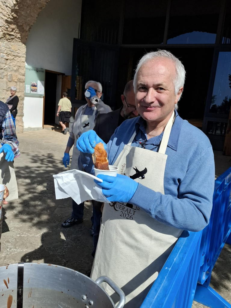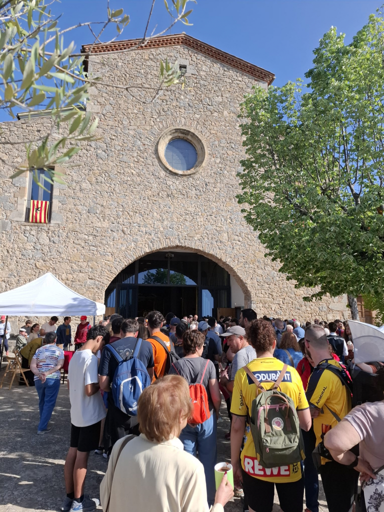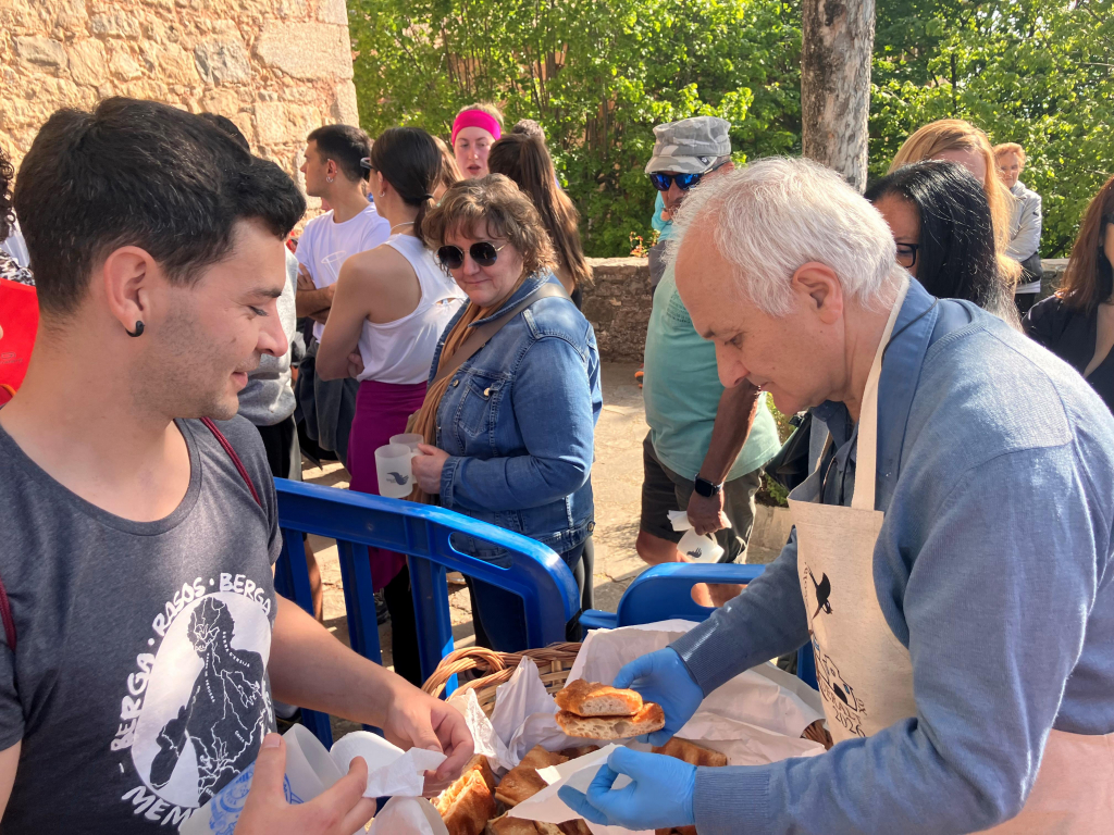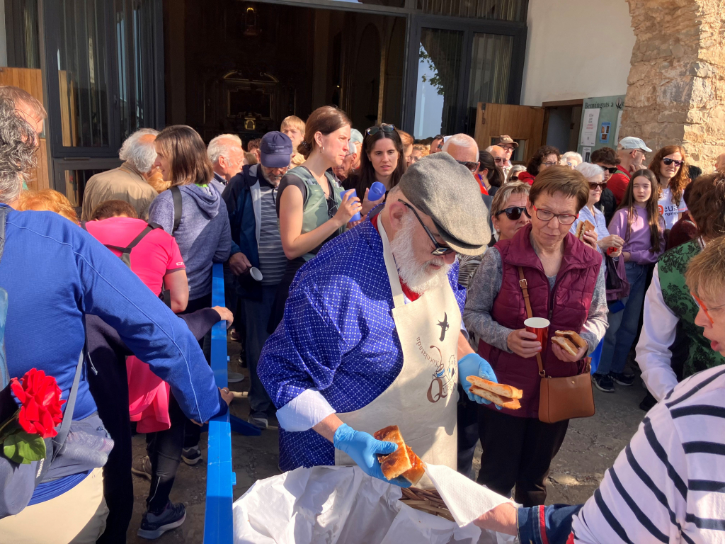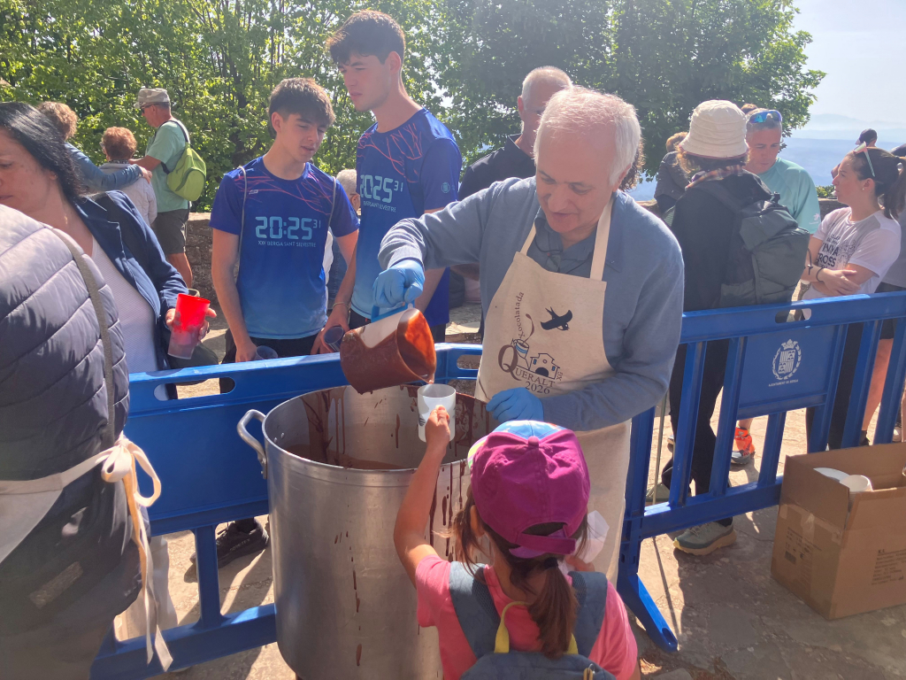 Tot seguit el 4 xocolaters va repartir la coca i xocolata a la multitud de gent que havia pujat i que omplia la plaça i els voltants del Santuari.